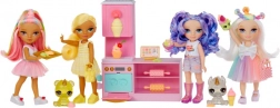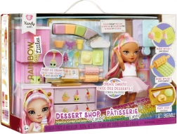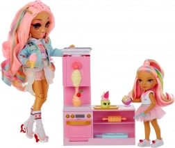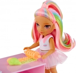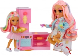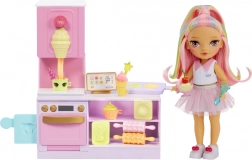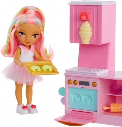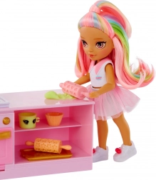Przeżyj słodką przygodę z uroczą laleczką z kolekcji RAINBOW HIGH LITTLES i jej stylową cukiernią. Kuchnia z piekarnikiem, foremkami i dyspenserem do lodów oferuje mnóstwo sposobów na tworzenie kolorowych pyszności i rozwijanie kreatywności oraz małej motoryki. Dzięki pięciu kolorowym masom plastycznym dzieci mogą upiec croissanty, dekorować babeczki i „kręcić” lody.