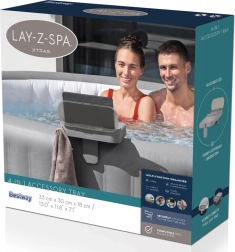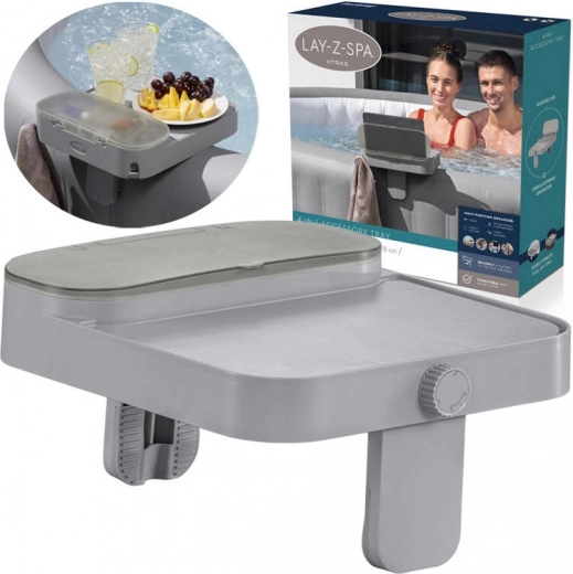 Ciesz się relaksem w jacuzzi bez kompromisów – multifunkcyjna półka Bestway 4w1 do wszystkich modeli LAY‑Z‑SPA utrzyma napoje, telefon, tablet i drobiazgi zawsze pod ręką. Oferuje stolik, schowek odporny na zachlapania, wieszak na ręczniki oraz uchwyt na tablet w jednym. Dzięki regulowanym szczękom (5–25 mm) szybko i stabilnie przymocujesz ją do krawędzi jacuzzi.