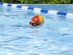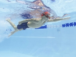 Wyraziste, dwukolorowe wzornictwo zwiększa widoczność dziecka w basenie i dodaje stylu podczas każdego treningu.