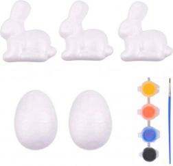 Zestaw zawiera trzy styropianowe zajączki i dwa styropianowe jajka. Częścią zestawu są również cztery intensywne kolory i pędzel, które umożliwiają łatwe i precyzyjne malowanie.