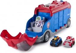 W zestawie znajdują się dwie mini wyścigówki bohaterów Chase’a i Marshalla oraz figurka Robo‑pieska z małym pojazdem. Transporter ma toczące się koła, składaną rampę i sprytnie zaprojektowaną przestrzeń ładunkową, ułatwiającą szybkie wysłanie ekipy.