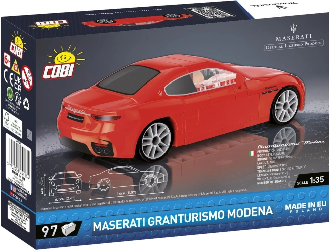 Delektuj się budową legendy – MASERATI GranTurismo Modena. Ta wysokiej jakości klockowa konstrukcja COBI wiernie oddaje linie nowoczesnej włoskiej elegancji i sportowego ducha auta z silnikiem V6 Nettuno Twin Turbo. Dzięki kompaktowym wymiarom w skali 1:35 świetnie nadaje się do gabloty i do kreatywnej zabawy.