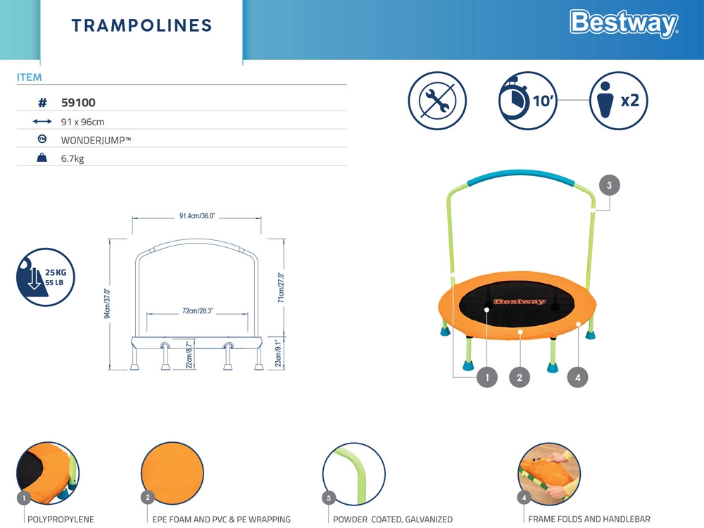 Wysokiej jakości trampolina Bestway Wonderjump została zaprojektowana do użytku zarówno w pomieszczeniach, jak i na zewnątrz. Dzięki stabilnej i wytrzymałej konstrukcji zapewnia bezpieczeństwo i komfort podczas użytkowania. To idealny wybór dla osób, które chcą poprawić kondycję, koordynację ruchową i ogólną sprawność fizyczną.