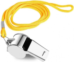 Wykonany z metalu, co zapewnia trwałość. Zawiera plastikową kulkę dla precyzyjnego dźwięku. Żółty sznurek pozwala na wygodne zawieszenie na szyi.