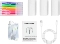Aparat, 3 rolki papieru termicznego, ładowarka USB-C, sznurek, 6 mini flamastrów i podręcznik użytkownika.