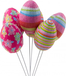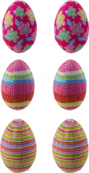 Zestaw zawiera jajka z kropkami, paskami i motywami kwiatowymi do barwnej wielkanocnej dekoracji.