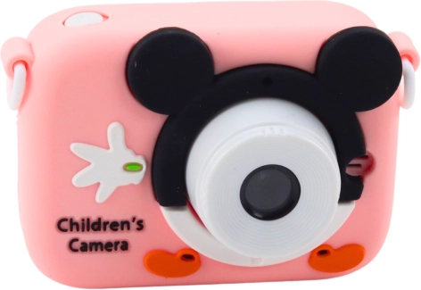 Świetny projekt z uszami myszki przyciąga uwagę małych fotografów. Różowy odcień z czarnymi, białymi i pomarańczowymi detalami jest idealny dla dzieci.