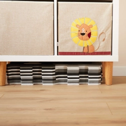 Czarno-biały design pasuje do nowoczesnych wnętrz, a mata pomaga utrzymać strefę zabawy w ryzach.