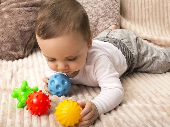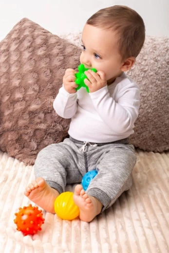 Piłeczki mają różne faktury i wyraziste kolory, które przyciągają uwagę dziecka i pomagają w rozwoju małej motoryki oraz orientacji przestrzennej: