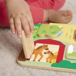 Plansza do zabawy zawiera 4 drzwiczki, które można otworzyć, aby odkryć różne przyjazne zwierzątka i ich młode. Wielkość drzwiczek jest idealna dla małych rączek, co ułatwia ich obsługę i wspiera rozwój umiejętności manualnych.