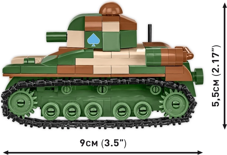 Wiernie odwzorowany RENAULT R-35 z trwałymi, wysokiej jakości nadrukami oraz możliwością wyboru polskich lub francuskich emblematów dla maksymalnej autentyczności.