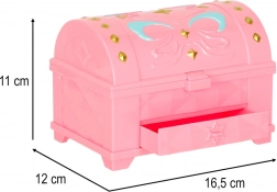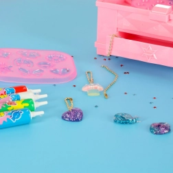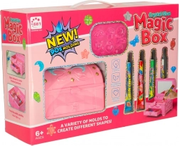 Magiczne pudełko to wspaniały kreatywny zestaw, który pozwala dzieciom tworzyć oryginalną biżuterię przy użyciu kolorowego kleju. Zestaw zawiera cztery tubki kleju w kolorach: czerwonym, zielonym, niebieskim i białym oraz cztery foremki o różnych kształtach. Dodatkowe elementy dekoracyjne, takie jak brokat i małe kryształki, umożliwiają personalizację biżuterii zgodnie z własną wyobraźnią. Do pracy dołączono pilniczek i pęsetę.