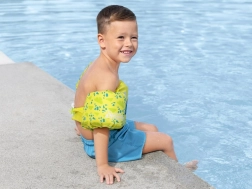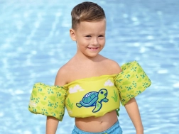 Szukasz niezawodnej pomocy do pierwszych kroków w pływaniu? BESTWAY Puddle Jumper łączy kamizelkę wypornościową i rękawki w jeden element, który pomaga dziecku utrzymać prawidłową pozycję na wodzie, nie ograniczając ruchu. Wesoły motyw żółwia i żywe letnie kolory motywują do aktywności i zwiększają widoczność w wodzie.