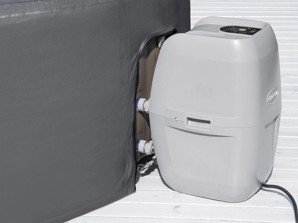 Praktyczne detale ułatwiają codzienne użytkowanie: regulowane paski z klamrami bezpieczeństwa zapewniają szczelne przyleganie bez strat ciepła, a zintegrowany zamek umożliwia podłączenie wbudowanej lub zewnętrznej pompy bez konieczności zdejmowania pokrywy.