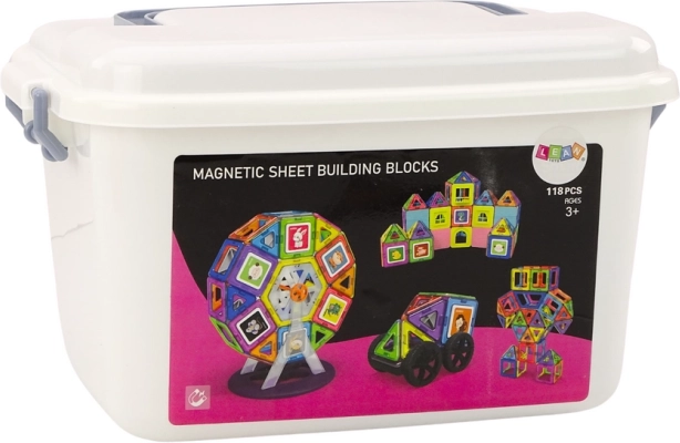 Magnetyczne klocki w walizce 118 szt.: koło młyńskie, budowle, naklejki. Silne magnesy, trwałe elementy, rozwój kreatywności i logiki. Idealne w podróży.