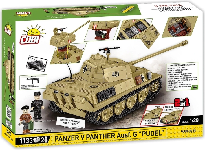 Zbuduj wierny model legendarnego czołgu Panzer V Panther Ausf. G „Pudel”, który zapisał się w historii podczas wydarzeń z 1944 roku. Ten zestaw COBI ucieszy kolekcjonerów oraz pasjonatów historii i techniki: oferuje precyzyjny wygląd, solidną konstrukcję i wiele funkcjonalnych detali, dzięki którym model nie tylko świetnie się prezentuje, ale także bawi podczas budowy i zabawy.