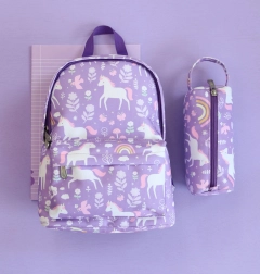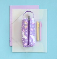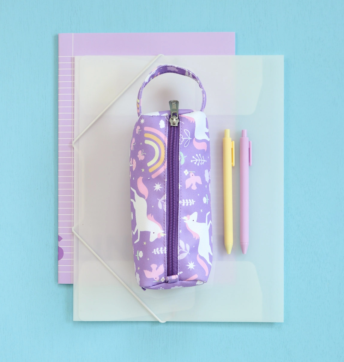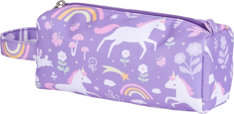 Fioletowe etui na kredki, flamastry lub artykuły piśmienne z motywami jednorożców, kwiatów i tęczy wykonane z trwałego poliestru. Idealne do szkoły, na wyjazdy lub zajęcia pozalekcyjne, zamykane na suwak z wygodnym uchwytem do łatwego przenoszenia. Zapewnia bezpieczne przechowywanie Twoich przyborów piśmienniczych.
