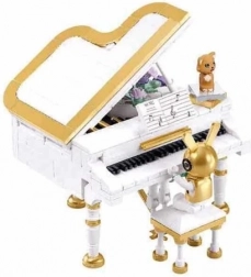 Detalicznym białym pianinem ze złotymi akcentami i kwiatowymi zdobieniami dopełnia stylowa figurka przy klawiaturze. Świetna dekoracja do witryny i na biurko.