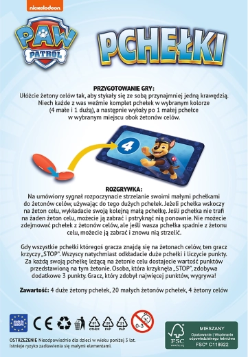 Klasyczna zręcznościowa gra Pchełki w bajkowym wydaniu z motywem Psi Patrol ucieszy wszystkich małych graczy. Zadaniem jest za pomocą pchełek przeskakiwać na docelowe żetony i zdobyć jak najwięcej punktów. Proste zasady, szybkie rundy i zabawa dla całej rodziny!