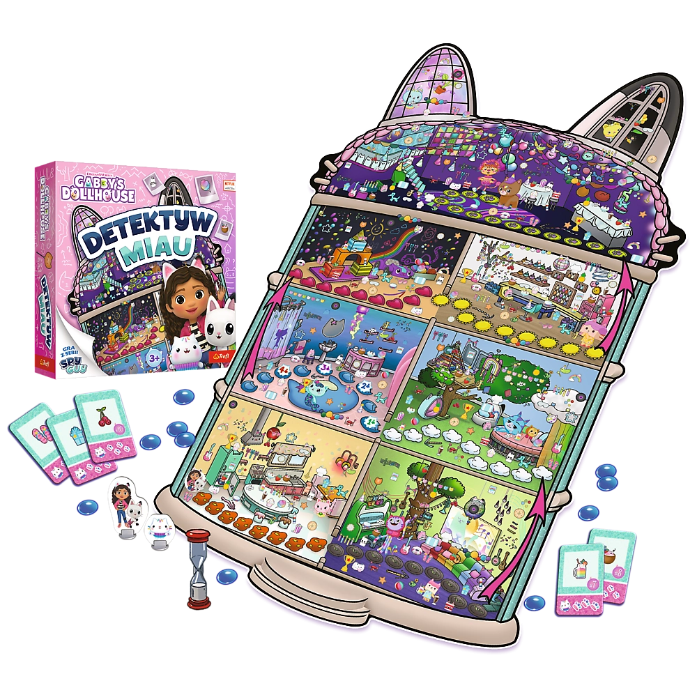 Wyrusz tropem wraz z bohaterami z Kociego domku Gabi w rodzinnej kooperacyjnej grze Detektyw Miau od TREFL. Połączcie siły, trenujcie spostrzegawczość i współpracę graczy, szukajcie wskazówek na dużym planie w kształcie domku i złapcie łakomego kociaka, zanim dotrze na posypkową imprezę bez ważnego składnika.