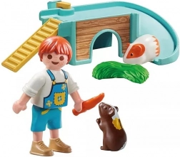 Odkryj świat pupili z zestawem do zabawy PLAYMOBIL, w którym chłopiec z troską opiekuje się dwiema uroczymi świnkami morskimi. Kolorowy domek dla gryzoni z kryjówkami, schodkami i zjeżdżalnią oferuje mnóstwo możliwości zabawy i wymyślania nowych historii. W zestawie znajdują się także akcesoria do karmienia, w tym marchewka, pęczek trawy i poidełko.