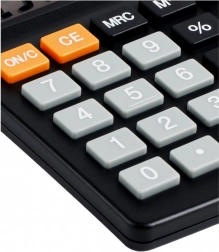 Oferuje podstawowe operacje arytmetyczne, funkcje pamięci (M+, M-, MR, MC), obliczanie procentów i pierwiastka. Kontrastowe pomarańczowe klawisze funkcyjne i duże cyfry zapewniają szybką orientację i minimalizują błędy przy wprowadzaniu.