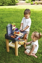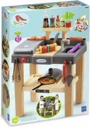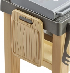 Praktyczne wyposażenie obejmuje piec do pizzy, strefę do gotowania i grillowania, zlew z kranem oraz deskę do krojenia. Bogaty zestaw akcesoriów z produktami spożywczymi i narzędziami kuchennymi daje nieskończone możliwości zabawy. Kompaktowe wymiary 49 × 32 × 55 cm zmieszczą się na tarasie, balkonie i w pokoju dziecięcym.