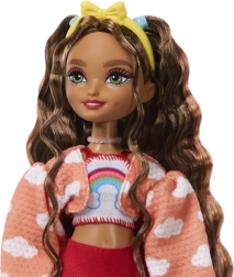 Długie, falowane brązowe włosy z opaską i kokardą, crop top z tęczą, sweterek w chmurki oraz czerwona spódnica – wszystko łatwe do łączenia i zdejmowania.
