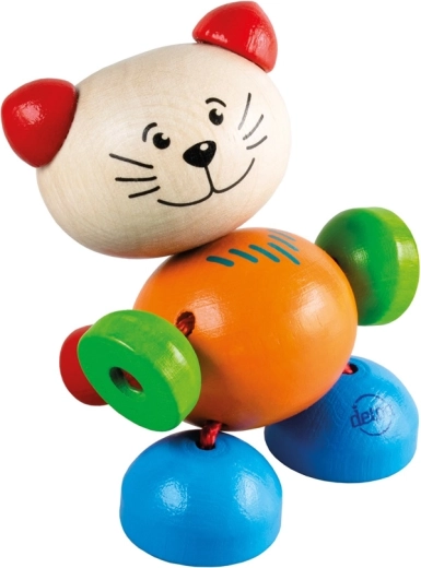 Urocza drewniana zabawka DETOA w kształcie kotki ucieszy już od 8 miesiąca. Dzięki nawleczonym kształtom na gumce elementy poruszają się, obracają i wyginają, co świetnie wspiera małą motorykę oraz percepcję sensoryczną. Wykonano z wysokiej jakości drewna w Czechach, bezpieczne dla zdrowia i spełnia normy UE dotyczące bezpieczeństwa zabawek.