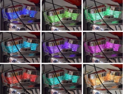 - Efekty świetlne: cylindry migają w rytm muzyki, osobny przycisk do przedniej lampy, przełącznik jazdy wolna/szybka.