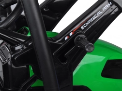 Obsługa jest prosta: przełącznik zapłonu włącza przednie światła, pedał dodaje gazu, a po jego zwolnieniu aktywuje się hamulec. Dźwignia zmiany biegów oferuje trzy tryby (wsteczny / wolno / szybko) z możliwością blokady wyższej prędkości na bezpieczny start. Panel multimedialny odtwarza dźwięki silnika, opowieści i piosenki oraz pozwala podłączyć własną muzykę przez Bluetooth, USB lub MP3. Kierownica zasilana bateriami 2×AA ma przyciski klaksonu.