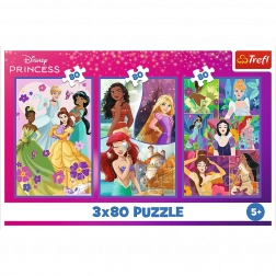 Puzzle 3x80 Księżniczki Disney Przyjaciółki zawierają trzy różne puzzle z motywami księżniczek Disneya. To opakowanie zapewnia zabawę dla więcej dzieci, ponieważ oferuje trzy puzzle z 80 elementami.