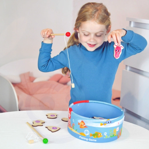 Łów jak najwięcej kolorowych rybek za pomocą drewnianych wędek z magnesem i ciesz się wspólną, rodzinną zabawą. Gra TOOKY TOY jest idealna dla jednego lub większej liczby dzieci, wspiera koncentrację, precyzję oraz zdrową rywalizację. Praktyczne opakowanie z uchwytem ułatwia przenoszenie.