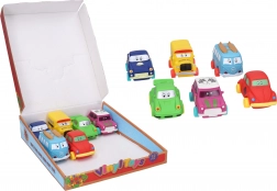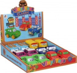 Leciutkie autko z miękkiego plastiku o długości 9 cm z wolno toczącymi się kołami. Do wyboru jest 6 wariantów: Garbus, Trabant, sportowe, Mini, autobus, dostawczak.