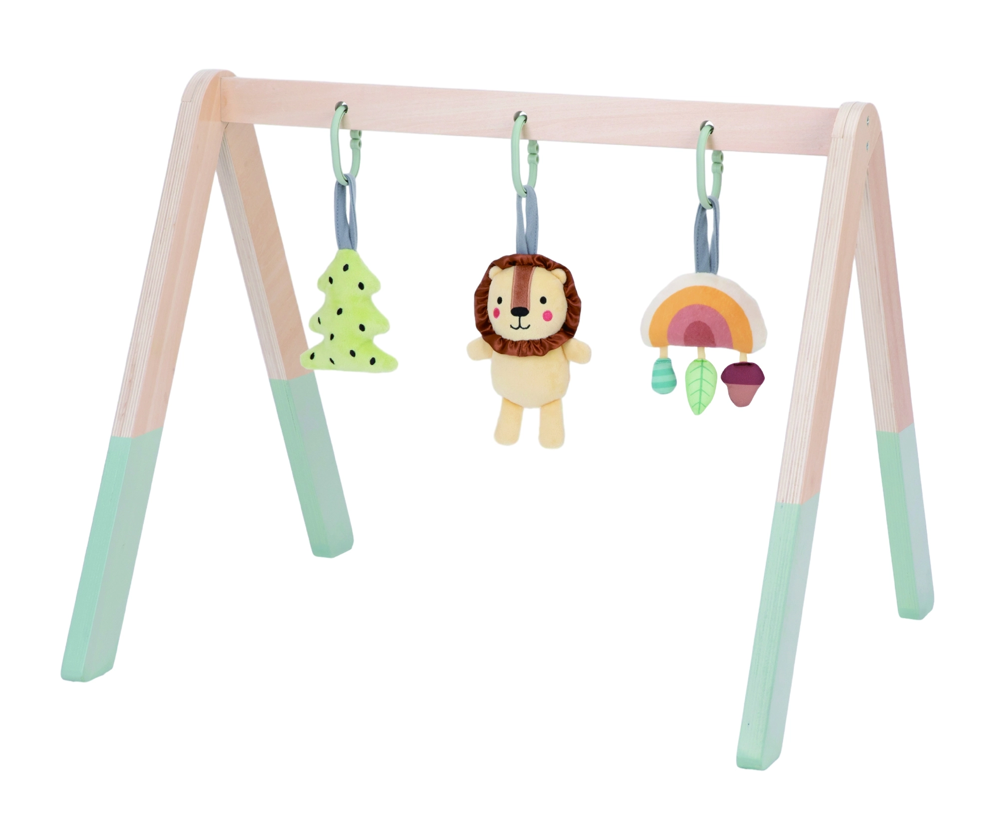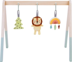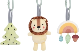 W zestawie znajduje się kolorowa zawieszka „choinka” z efektem szeleszczenia, uroczy lew z grzechotką i dzwoneczkiem oraz błyszcząca tęcza z trzema mniejszymi elementami o różnych fakturach i kolorach, która po naciśnięciu piszczy. Wszystko utrzymane w pastelowych barwach i pomalowane bezpiecznymi dla dzieci farbami.