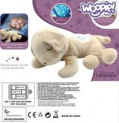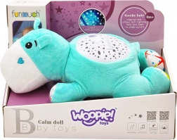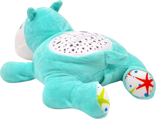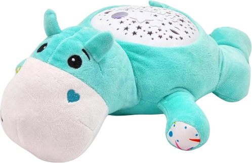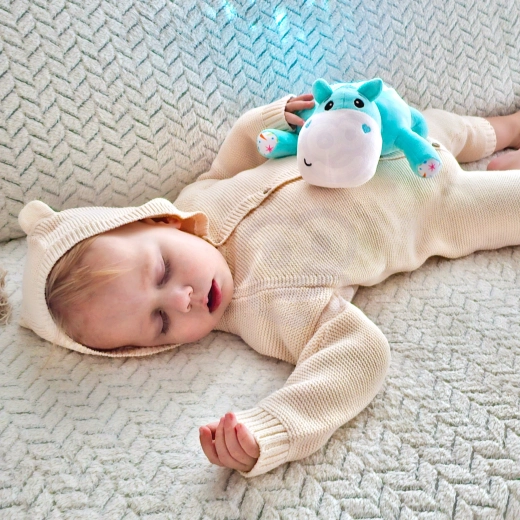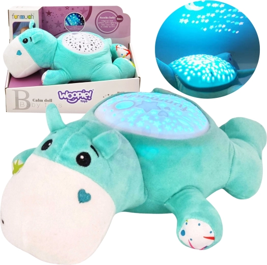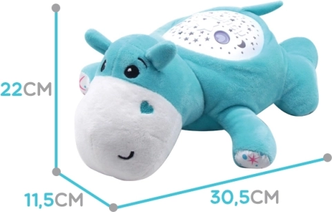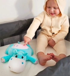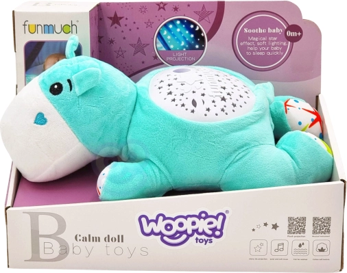 Pluszowy hipopotam WOOPIE BABY tworzy przed snem przytulną atmosferę dzięki delikatnemu światłu projektora oraz relaksującym kołysankom z odgłosami natury. Światełka płynnie zmieniają kolory i wyświetlają gwiazdy, księżyc oraz planety, co daje dzieciom poczucie bezpieczeństwa.