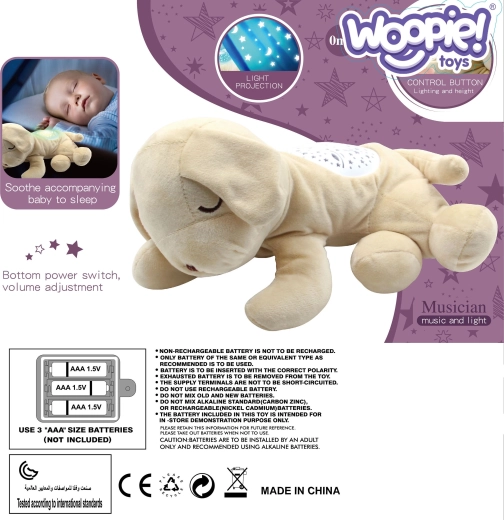 Moduł muzyczny odtwarza kilka kołysanek nawet przez 20 minut bez przerwy, więc maluch zaśnie bez konieczności ponownego uruchamiania. Obsługa jest prosta – przycisk na brzuszku do światła i muzyki oraz 2 poziomy głośności dla idealnego natężenia dźwięku w pokoju dziecięcym. Mięciutkie ciało wypełnione jest delikatną watą, a mechanizm można łatwo wyjąć do bezpiecznego prania.