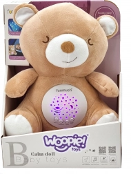 Uroczy pluszowy miś WOOPIE BABY to idealny towarzysz zasypiania dla niemowląt i starszych dzieci. Oferuje efekty świetlne w brzuszku, 10 kołysanek, kojące szumy i bicie serca oraz 3 poziomy głośności. Mięciutkie wykonanie, łatwa pielęgnacja dzięki wyjmowanemu mechanizmowi oraz bezpieczne dla dzieci wykończenie czynią z misia niezastąpioną pomoc w spokojnym śnie.