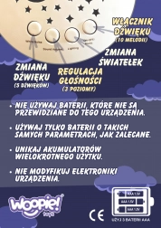 - Efekty świetlne (zmieniające się kolory), biały szum, bicie serca, 10 kołysanek