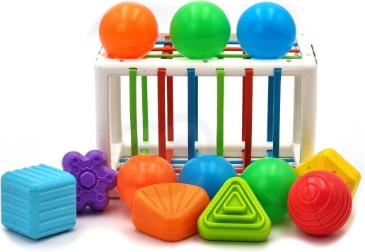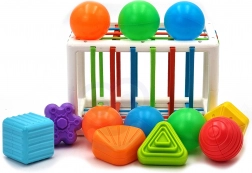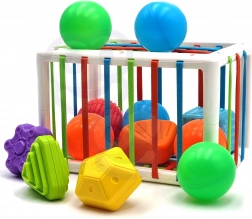Zawiera łącznie 12 elementów, w tym 6 miękkich piłeczek i 6 twardych sensorycznych kostek.