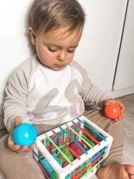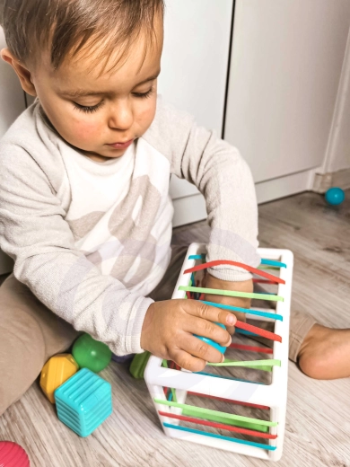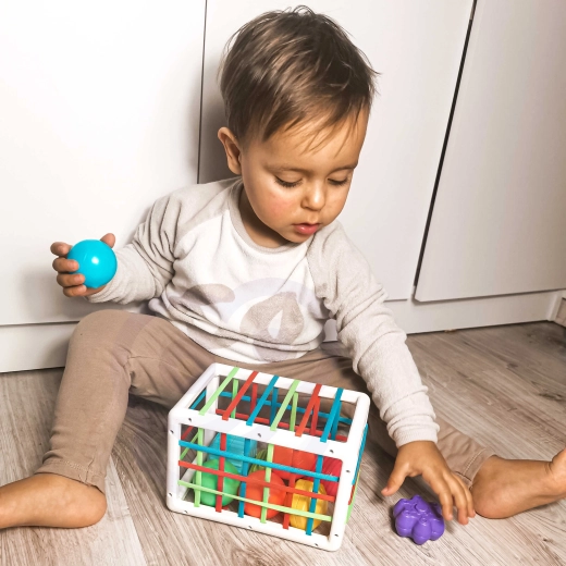 Dziecko rozwija swoje zmysły i umiejętności manualne, bawiąc się kostką i różnymi kształtami.