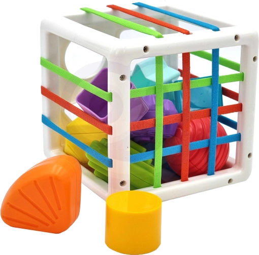 Ta kolorowa kostka sensoryczna łączy dwie ulubione aktywności: wkładanie elementów przez elastyczne paski oraz sortowanie do otworów kształtów. Dzieci uczą się rozpoznawać kolory i figury geometryczne, rozwijają ciekawość i umiejętność koncentracji. Solidne elementy łatwo się chwytają, a kostka ma praktyczną konstrukcję do wygodnego przenoszenia i przechowywania.