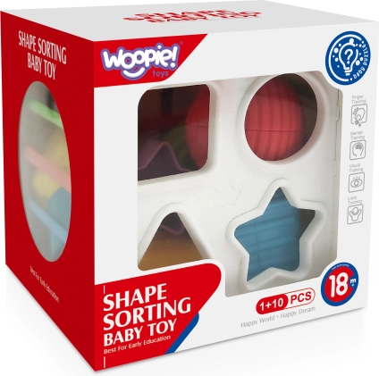 Sensoryczna kostka WOOPIE to sprytna zabawka dla dzieci od 18 miesięcy, która wspiera rozpoznawanie kształtów i kolorów, rozwój małej motoryki oraz percepcji sensorycznej. Dzięki elastycznym gumkom oraz jednej ściance z klasycznym sorterem kształtów dzieci ćwiczą koordynację i logiczne myślenie podczas wkładania i wyjmowania 11 solidnych elementów o różnych kształtach i fakturach.
