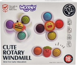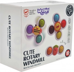 Zestaw WOOPIE zawiera trzy urocze spinnery w kształcie słoneczka, pszczółki i marchewki. Dzięki wytrzymałym łożyskom zabawki obracają się płynnie i długo, a kolorowe gumowe elementy zachęcają dzieci do naciskania i odkrywania różnych faktur. Przyssawki umożliwiają łatwe mocowanie na gładkich powierzchniach – oknie, płytkach, wannie lub stole.