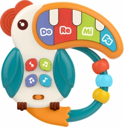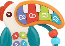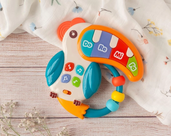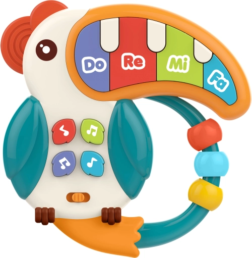 Pelikan od Woopie to idealna pierwsza muzyczna zabawka dla najmłodszych. Dzięki kolorowym klawiszom z dźwiękami „Do, Re, Mi, Fa” dzieci łatwo odkrywają świat muzyki, a przesuwając koraliki i naciskając przyciski trenują małą motorykę oraz koordynację oko–ręka. Miękki grzebień i łuk z kółeczkami działają jednocześnie jako gryzak, przynosząc ulgę przy ząbkowaniu.