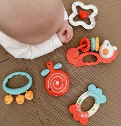 Każda grzechotka i gryzak ma unikalny projekt, który zapewnia dziecku różnorodność i zabawę.