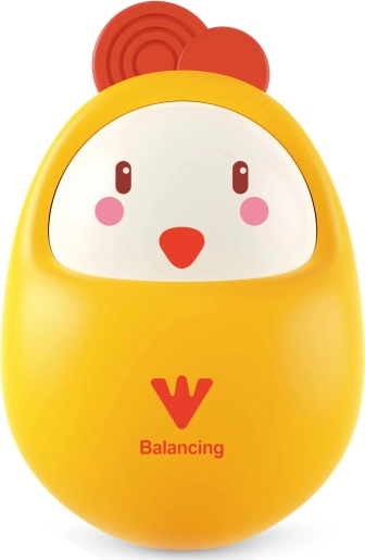 Sprytna konstrukcja typu roly-poly zapewnia płynne bujanie po każdym popchnięciu, kurczątko zawsze wraca do pozycji pionowej.