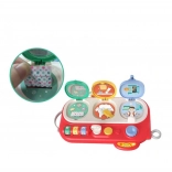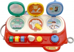 Ta pomysłowa zabawka edukacyjna ma trzy okienka, z których każde otwiera się w inny sposób – na kombinację symboli, kluczykiem lub przyciskiem i obrotowym pokrętłem. W środku dzieci znajdą różne niespodzianki: wysuwane „chusteczki”, obrazek ząbka z ruchomą szczoteczką oraz postać z obrotowym wyborem ubranek. Każdy gest ma wyraźny efekt, co wzmacnia rozumienie przyczyny i skutku.