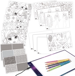 - Tablet, kabel USB, 5x dwustronna kredka, 1x czarny pisak, inspirujące arkusze