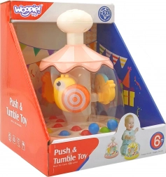 Wesoły różowy wirujący bączek ze zwierzątkami marki WOOPIE zachwyci maluchy już od 6. miesiąca. Po naciśnięciu górnego przycisku zwierzątka zaczynają się kręcić, a kolorowe kuleczki podskakują jak na małej karuzeli. Zabawka zapewnia stymulację wzrokową i słuchową, wspiera małą motorykę i koordynację ręka–oko. Wykonana z bezpiecznych i trwałych materiałów do codziennej, spokojnej zabawy.